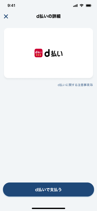 | d barai | Tap "Pay with d barai." | The payment cannot be completed due to insufficient balance on d barai or other reasons. ↓ Please contact d barai for assistance. The link to d barai has been disconnected. ↓ Please delete and re-register it from [Payment Method] in the in-app menu. Ref: About d barai (pay each time) overview and precautions |