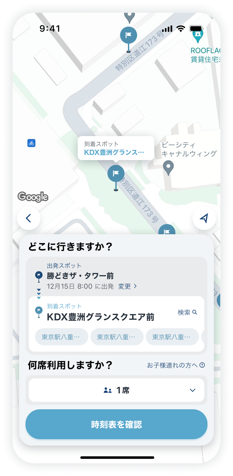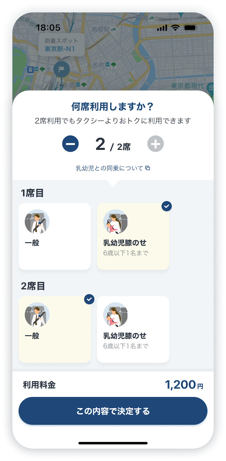 When holding a baby/toddler on your lap, a screen asking "Number of Seats" will appear when arranging a ride, so please tap [1 Seat].